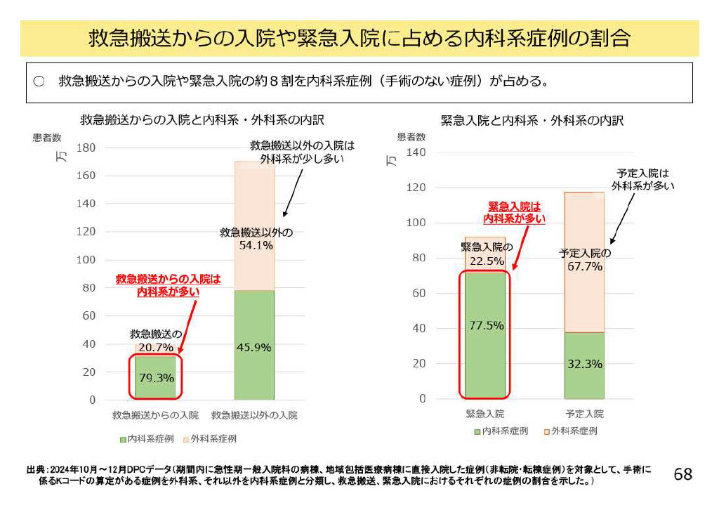 現状では、救急搬送または緊急入院患者の評価期間が令和6年度の診療報酬改定で「入院後2日間」に短縮されたことで、内科系が特に不利となりました。なぜなら、救急搬送患者の約8割が内科系患者だからです。