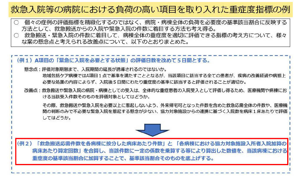 そのため、「評価期間を元の5日間に戻す」「または救急搬送や緊急入院が多い病棟には、基準該当率に一定の上乗せを行う」といったアイデアが検討されています。後者の案は、病棟や病院の規模・搬送件数に応じて「該当率に+◯%を加算する」という方式で、日常の集計方法を変えずに導入できる可能性があります。