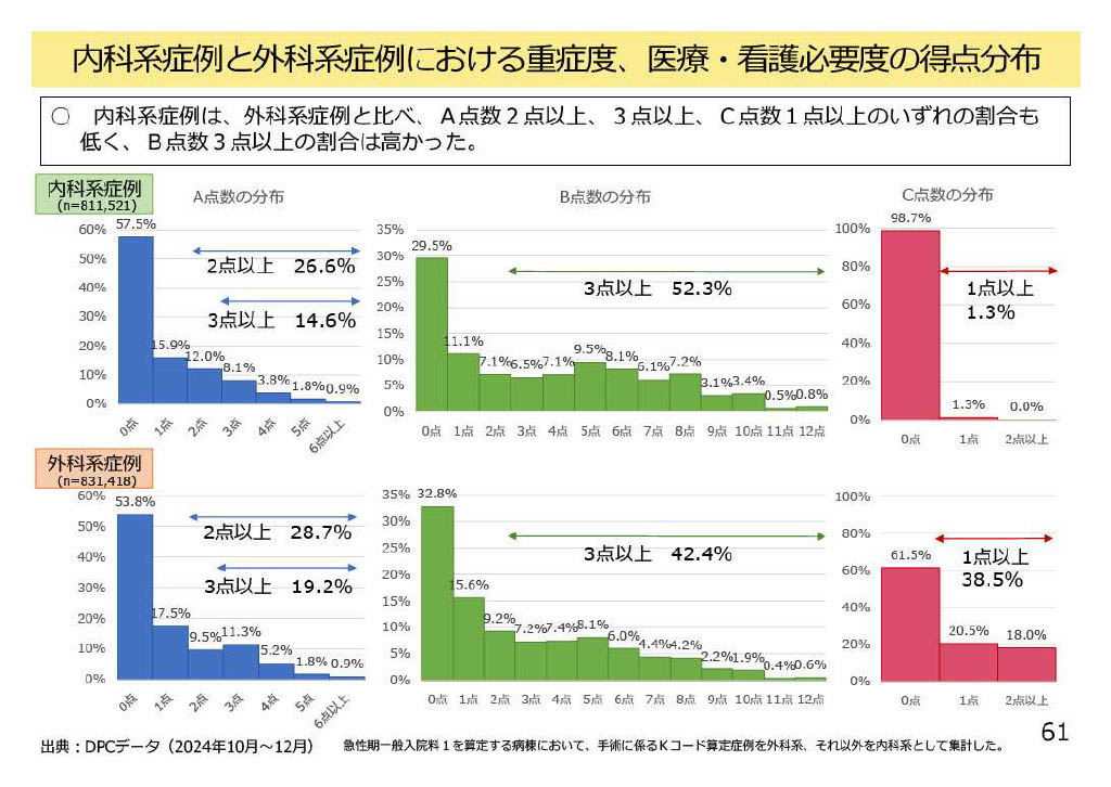 C項目1点以上の該当割合は、外科系:38.5%、内科系:1.3%と、圧倒的な差があります。