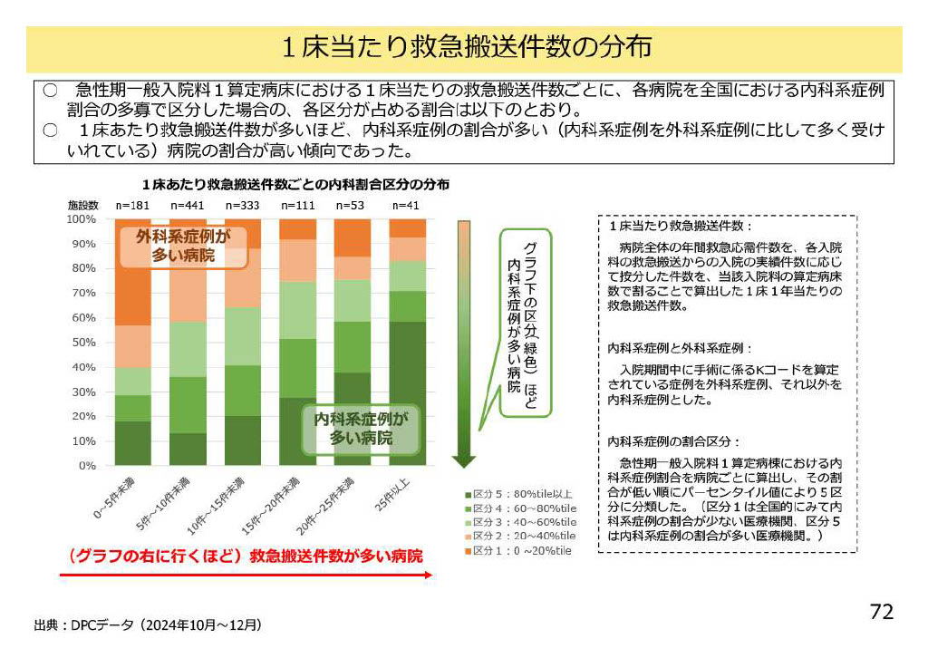 データによれば、救急搬送患者の約8割、さらに緊急入院患者の約8割が内科系疾患です。つまり、救急からの流入は内科系に集中しやすい構造になっているにもかかわらず、評価期間が短縮されたことで「負担の大きい内科系が、点数では不利になる」という状況が生まれています。