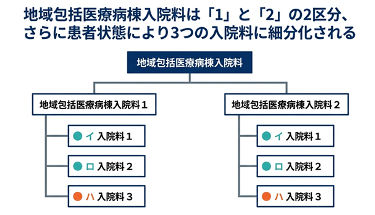 具体的には、病院単位で届け出る「地域包括医療病棟入院料1または2」と、患者ごとに決定される「算定区分(1・2・3/イ・ロ・ハ)」の組み合わせにより、計6つの区分が誕生します。