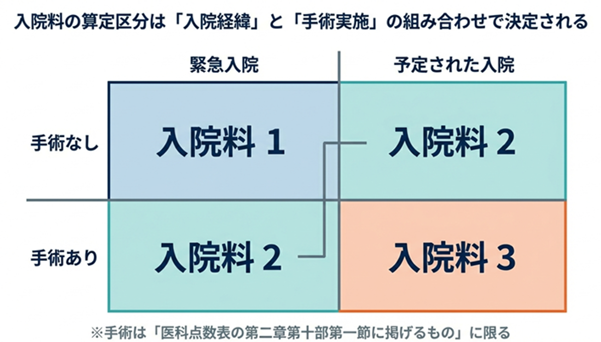 - 入院料2(ロ): 「緊急入院 + 手術あり」 または 「予定入院 + 手術なし」