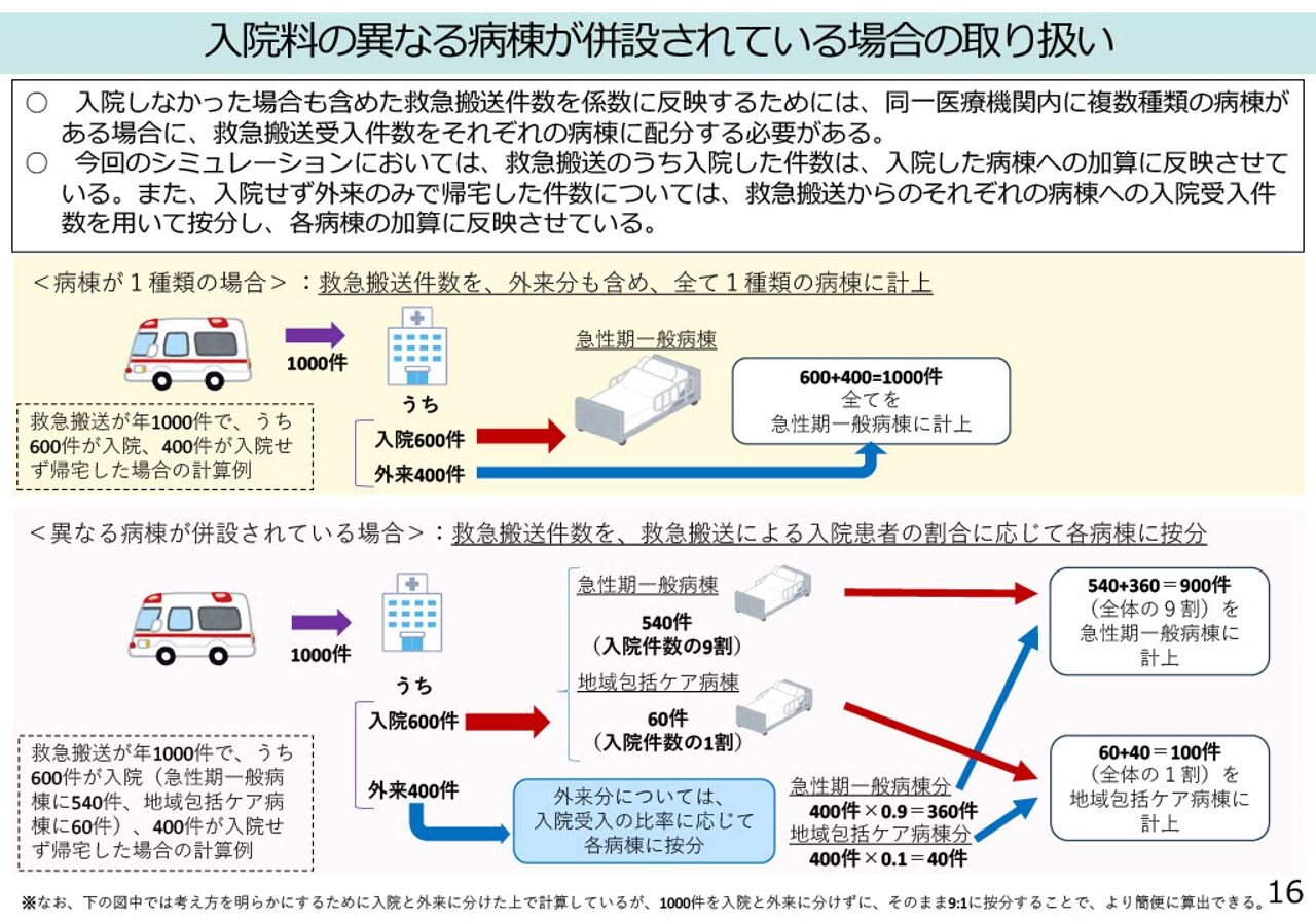 最新の案では、入院料の異なる病棟が併設されている場合、「按分(あんぶん)」した形で係数がプラスされる計算式が検討されています。