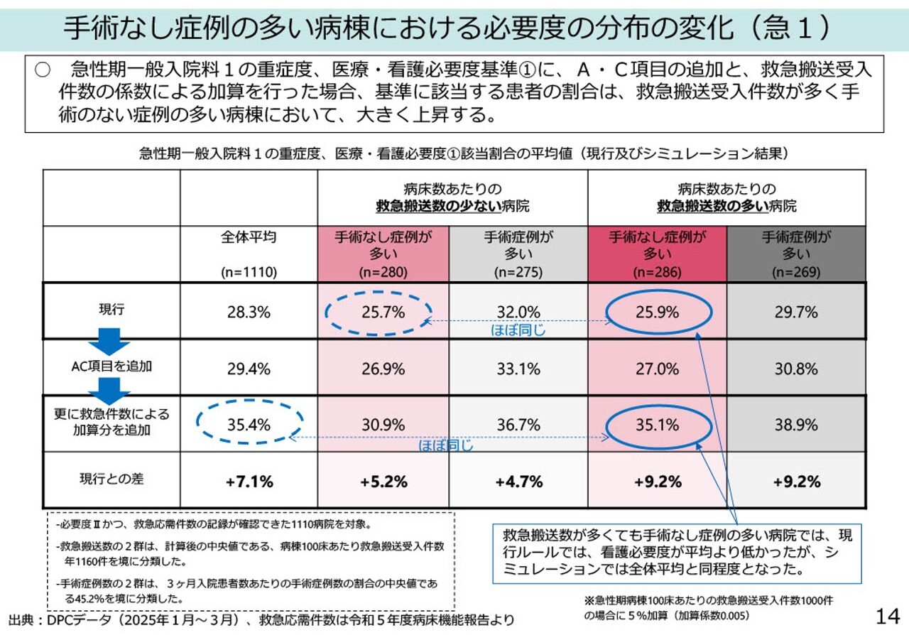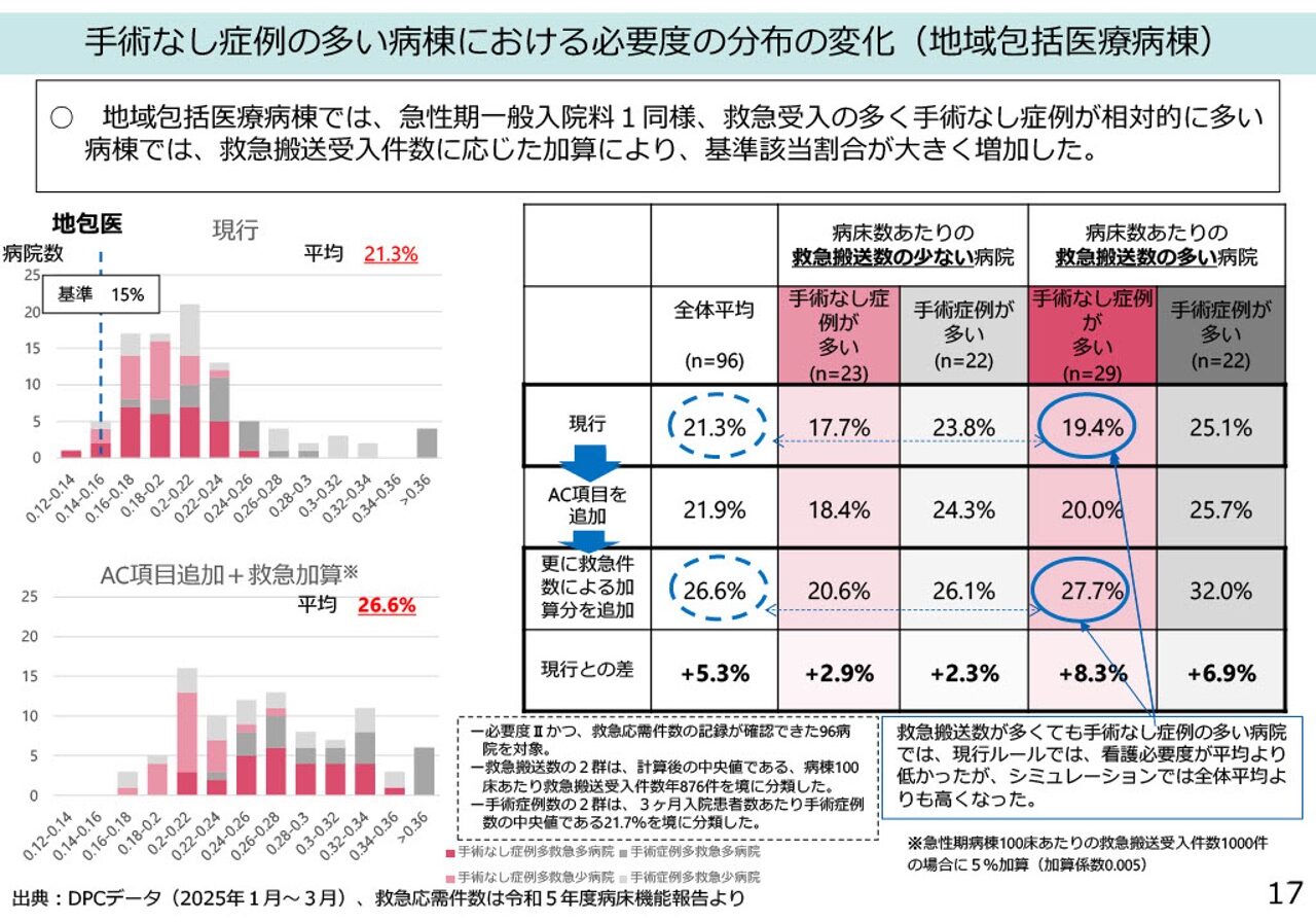 今回の改定議論で最も注目すべき点は、「手術なし症例」が多い病棟における変化です。
