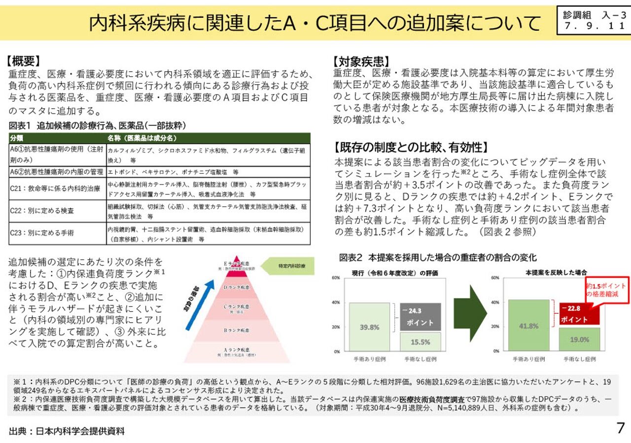 - 内科系の重症・急性期薬剤および処置等をA・C項目に追加する