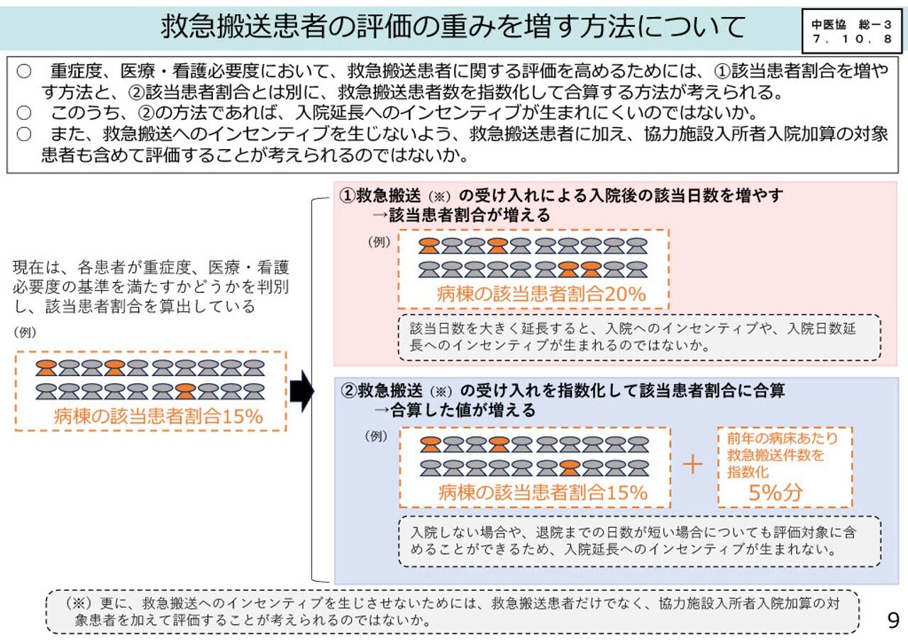 さて、もう一つの、そしてより大きなインパクトを持つ可能性があるのが「救急搬送患者の評価」の見直しです。