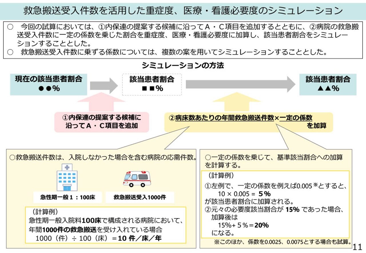 つまり、個々の患者さんの「該当日数」を延ばすというアプローチではなく、「病床数あたりの年間救急搬送件数」などを指数化し、それを看護必要度の基準値に足すという仕組みが検討されています。