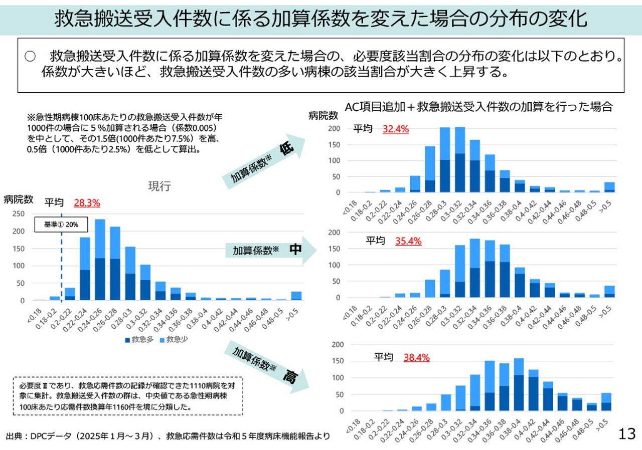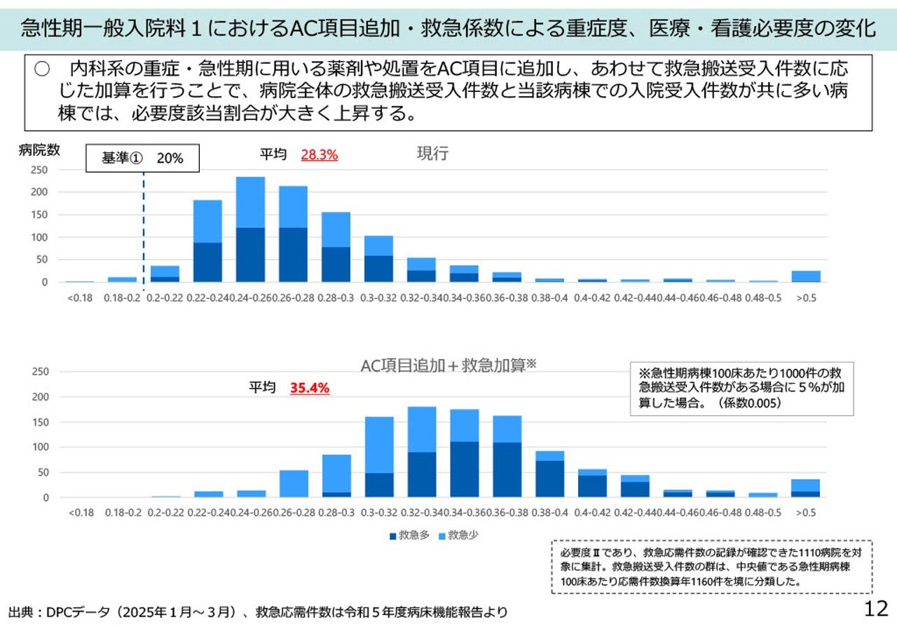 具体的な数字で見てみます。 現行の評価体系での該当割合が28.3%だったケースでシミュレーションを行ったところ、A・C項目の追加に加え、救急加算(係数5%の場合)を適用すると、なんと35.4%まで上昇するという結果になりました。これは非常に大きな上昇幅です。