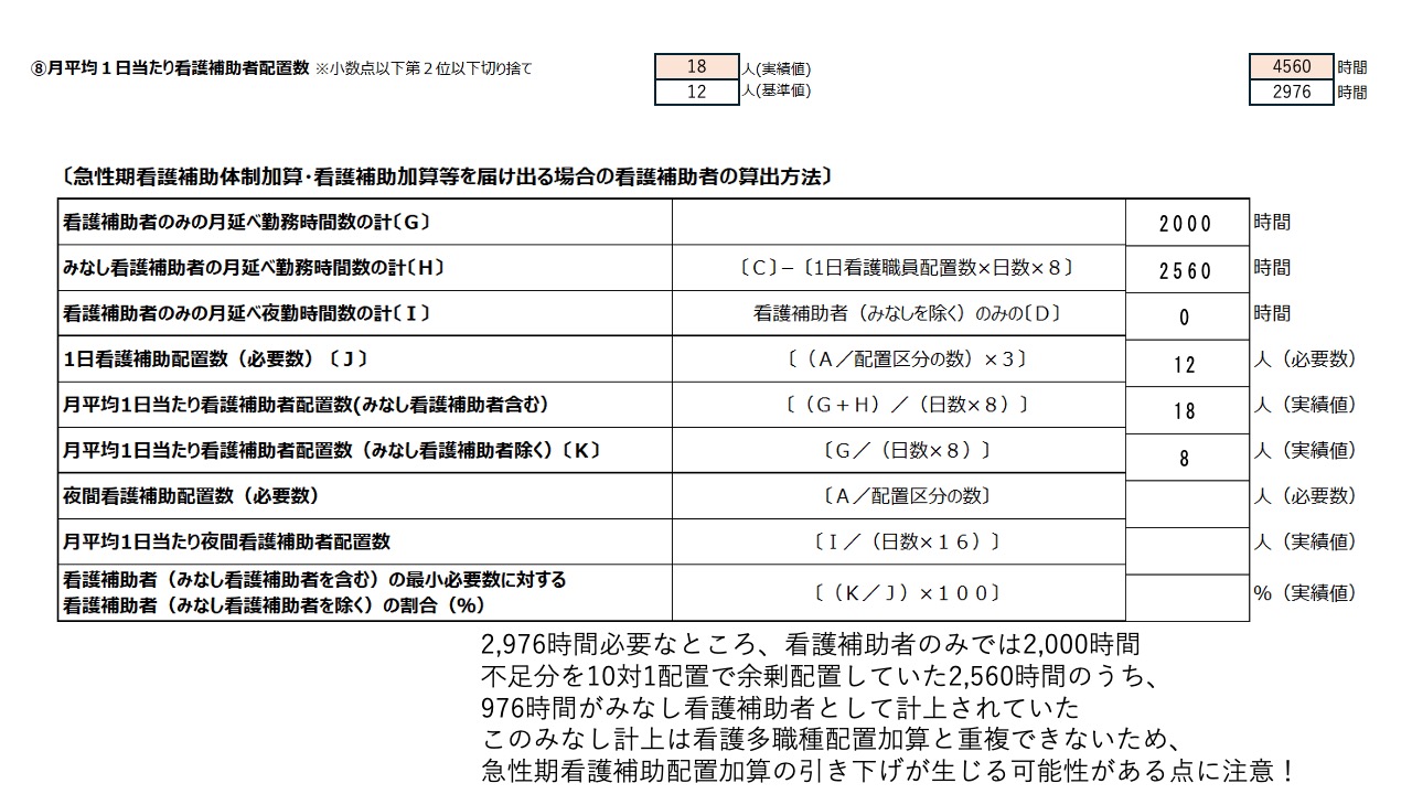 つまり、看護職員の余剰人数の部分は多職種配置で完全に使い切ってしまい、さらに不足まで起こしているため、「みなし看護補助者」として回せる余剰時間が全くなくなってしまうのです。