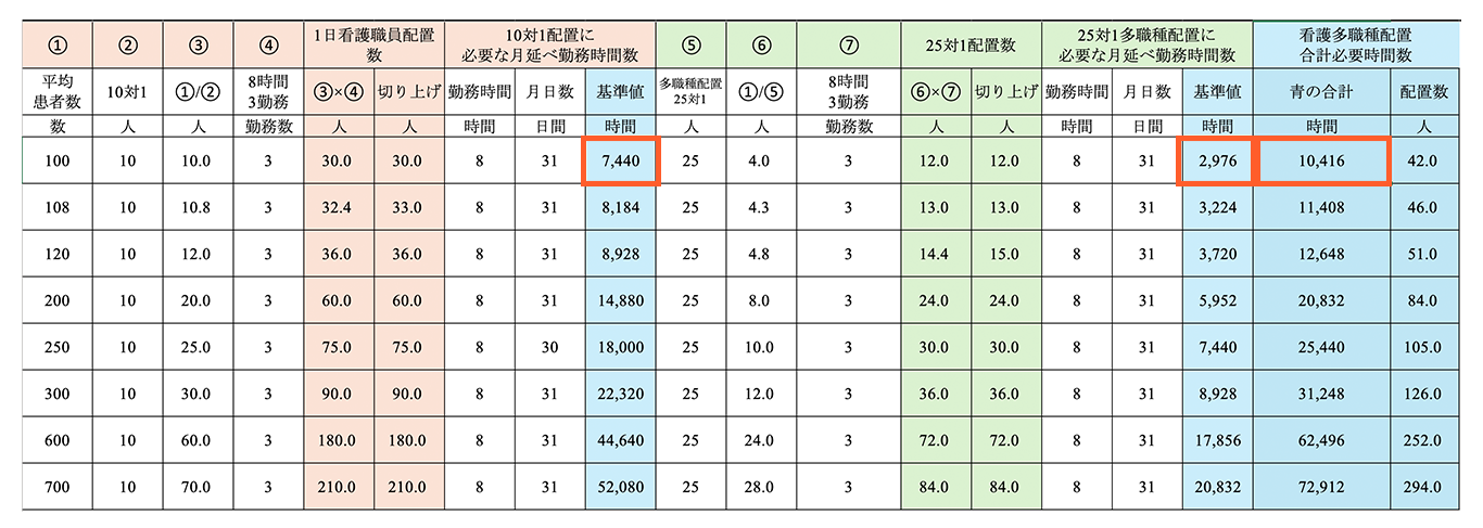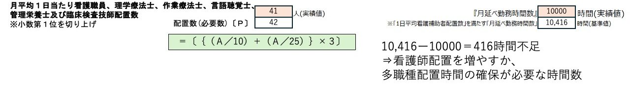 その表示されている数字と、上部で計算される従来の10対1の必要時間数(今回の例での7,440時間)を単純に足し合わせていただければ、現時点で多職種配置において必要な総時間数(10,416時間)を算出することができます。