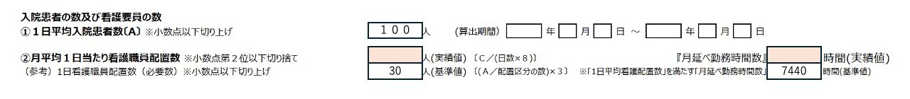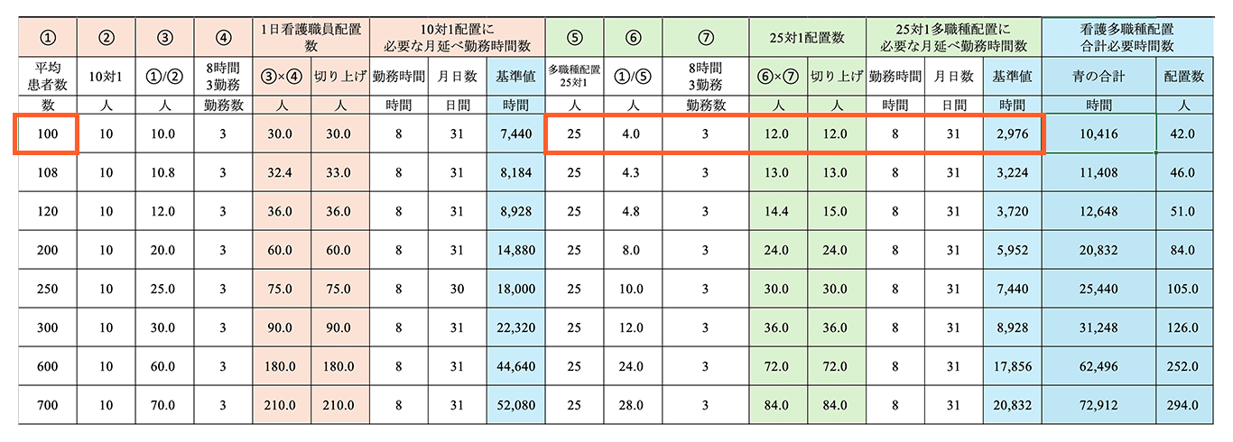 では、具体的に「1日平均入院患者数が100人」であったと仮定して、必要となる時間数と人数を計算してみましょう。手順を一つずつ追っていきます。