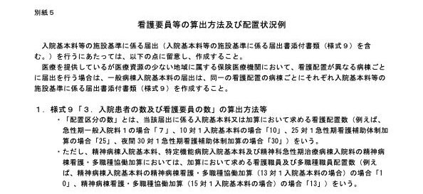 今回、診療報酬改定に伴って厚生労働省から提示されております資料の中に、「別紙5 看護要員等の算出方法および配置状況例」というものがございます。