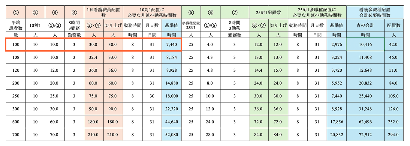 以上の計算から、平均患者数100人の場合、10対1配置を満たすための基準値となる必要時間数は「7,440時間」となります。これが10対1配置において月間で必要となる基準時間数です。対象月が30日や28日の月であれば、その月の日数をかけていただく形になります。