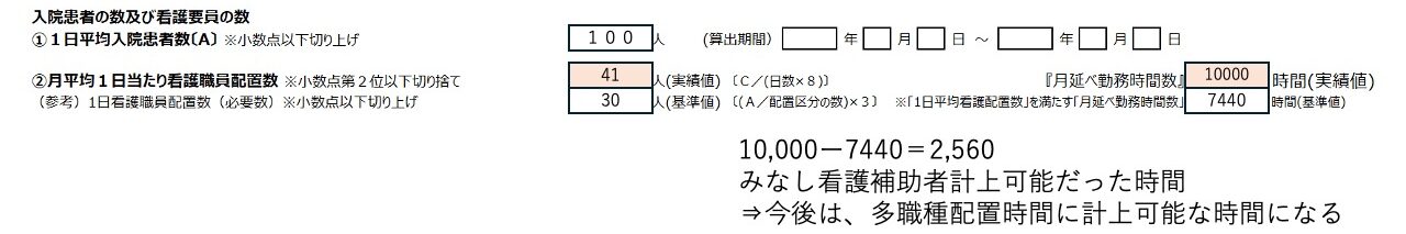 先ほどの例で振り返ってみましょう。従来の10対1配置のみであれば、必要時間数は7,440時間でした。これに対して実績が10,000時間あった場合、 10,000時間 – 7,440時間 = 2,560時間 この「2,560時間」が丸々余剰時間となり、そのまま「みなし看護補助者」の時間数として計上できていたのです。