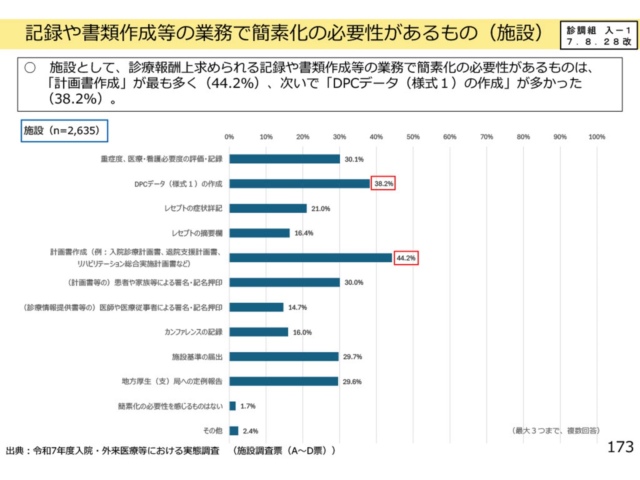 施設全体を対象としたアンケート結果を見ると、簡素化の必要性が高いものとして、「DPCデータの作成」(38.2%)と「各種計画書の作成(入院診療計画書・退院支援計画書やリハビリテーション実施計画書など)」(44.2%)が2トップに挙げられています。