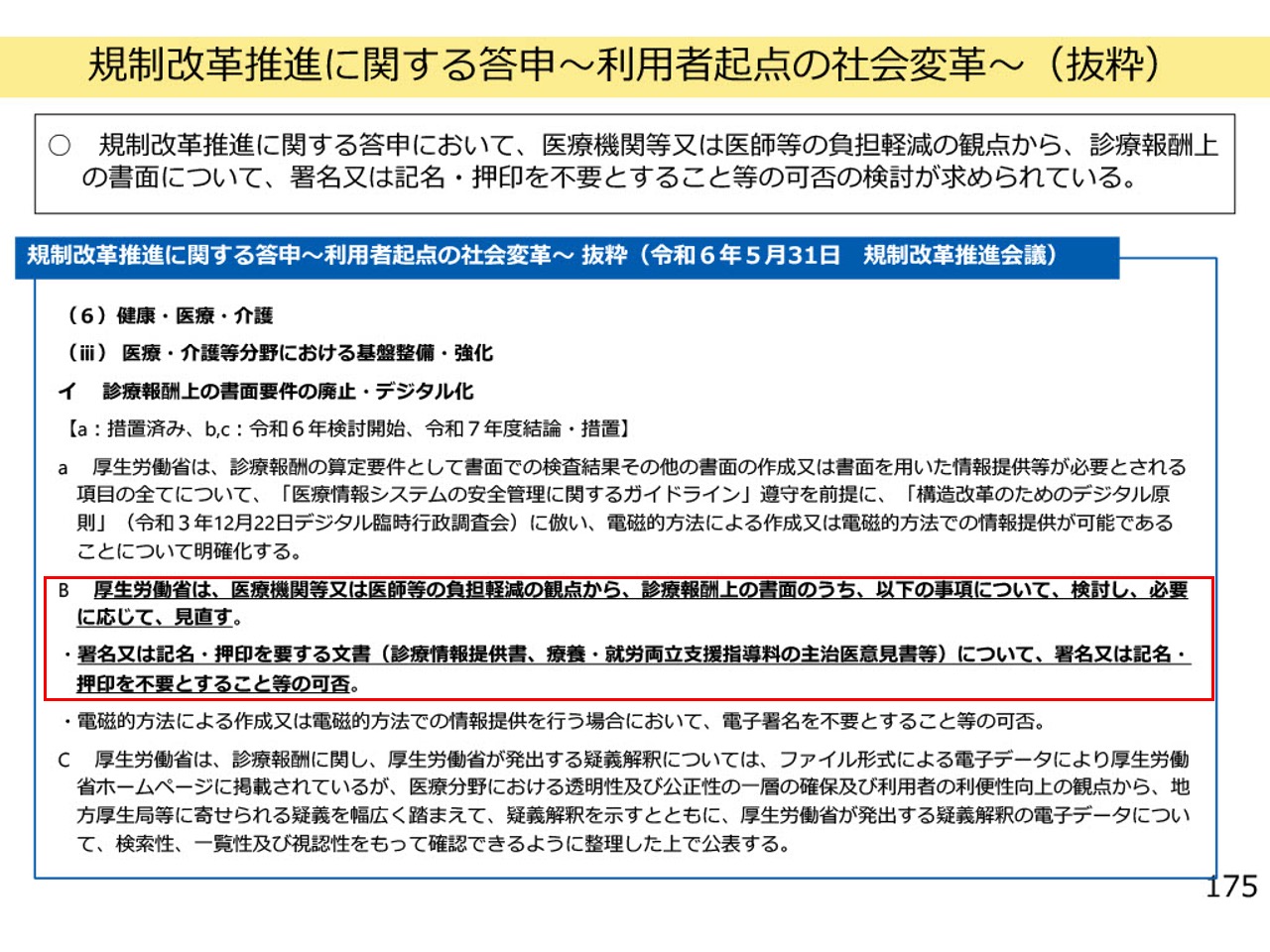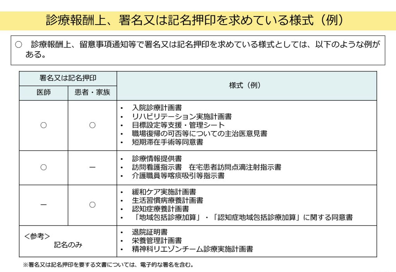 厚生労働省は現在、規制改革推進の観点から、診療報酬上で求められている署名や記名押印を不要にできるかどうか、その可否を検討する姿勢を見せています。
